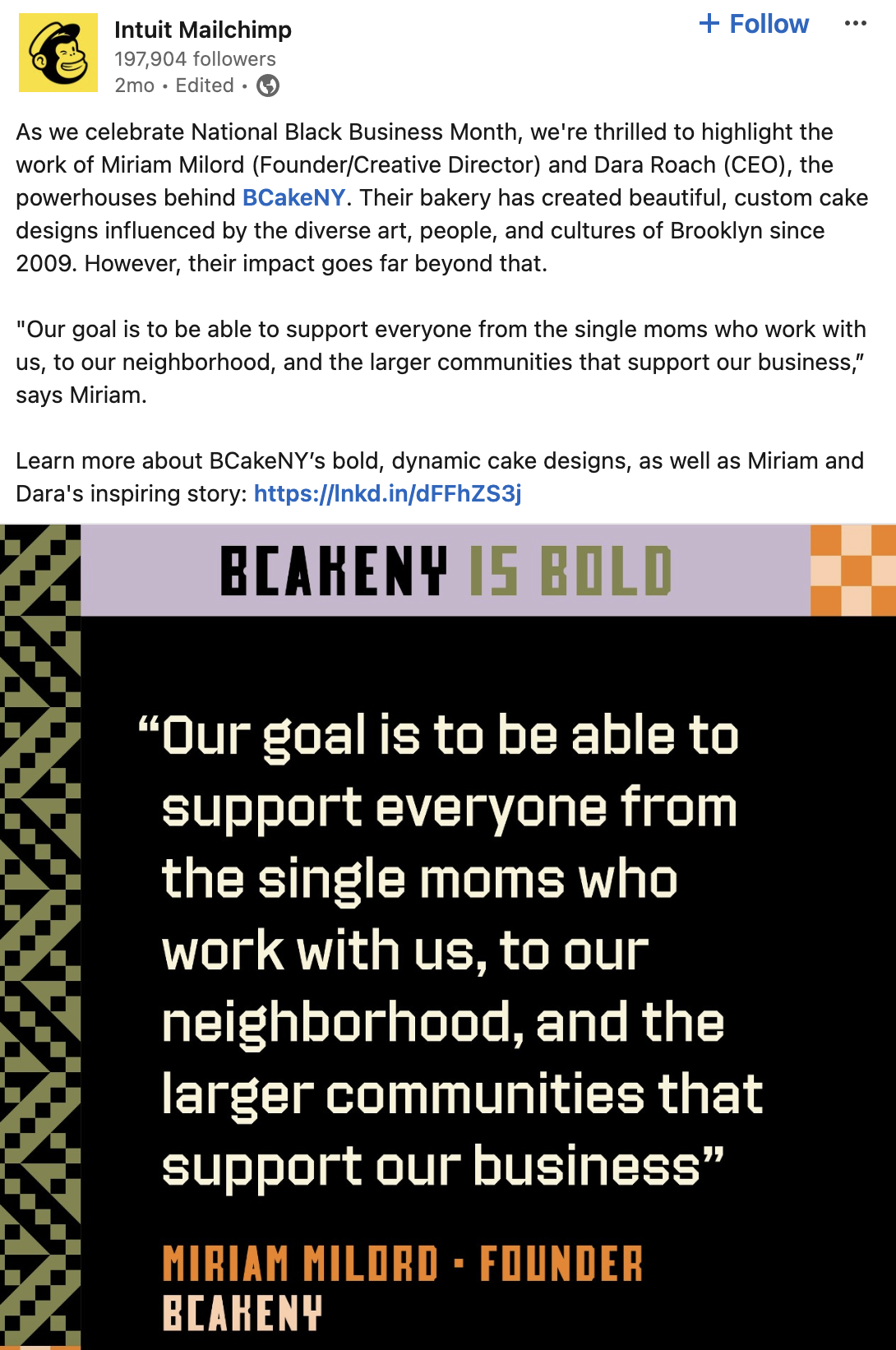 For National Black Business Month, I led the creative charge in Intuit Mailchimp’s cultural moment campaign, spotlighting Black-owned businesses across Facebook, Instagram, Threads, LinkedIn, and TikTok. I sourced and interviewed customers to uncover their unique stories, then translated those narratives into captivating caption copy, case studies, and design elements. From social posts to in-depth features, I created a multi-platform campaign that authentically celebrated entrepreneurship while driving meaningful engagement across diverse audiences.